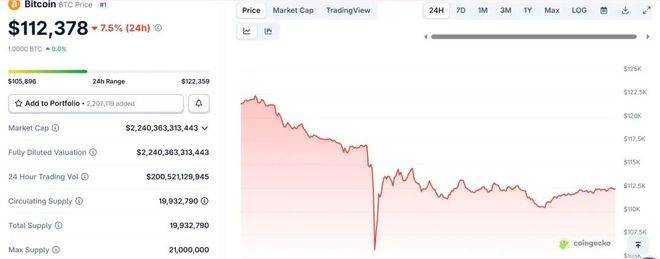 10日晚间,比特币价格从此前的约11.7万美元高位急速跌破11万美元关口,一度狂泻超过1万美元。截至11日清晨,比特币24小时内跌幅达到13.5%,最低触及10.593万美元。
