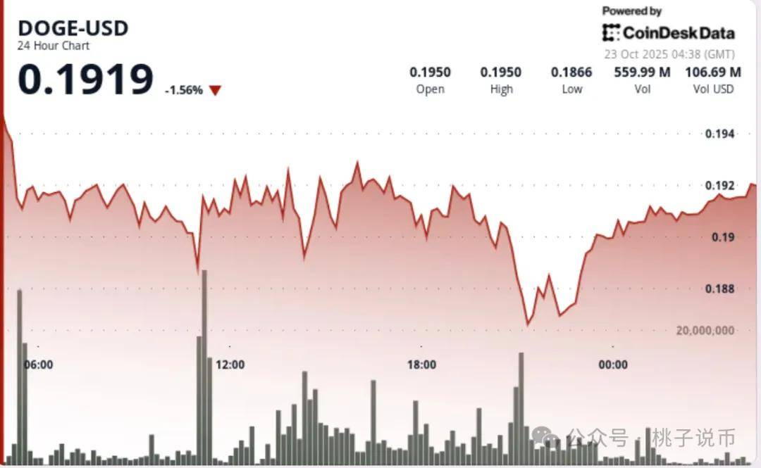 支撑位在0.1860美元附近形成,午盘多次成功守住。最后一小时,狗狗币价格稳定在0.1916美元,成交量回落,显示订单流在早前波动后趋于平衡。