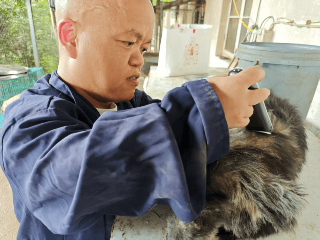 在安徽池州远郊某个不起眼的动物救助站,一袭僧衣,身型有些特别的背影格外引人注目。