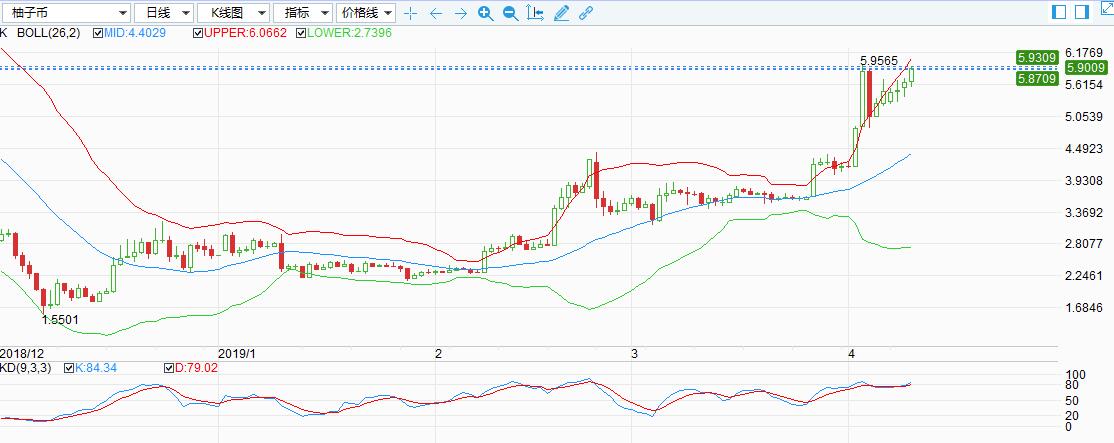 在主流货币中,柚子币的涨幅最为突出,截止周二,柚子币(EOS)已经连续五个交易日收高,仍在向年内高位发起测试,目前价格仍在向布林带上轨靠近,有望刷新高位,但突破后可能会短线转跌。