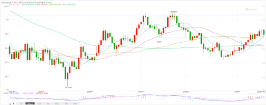美元指数近期延续反弹走势,1月15日最高涨至99.49,本周一亚洲市场美指在99.49位置迎来回落行情,最低跌至99.05。日线观察,虽然短期美指持续走出反弹行情,并暂时突破99.00的技术压制,但目前观察持续上行的难度偏大,日内美指已显现出上涨乏力的状态,如果周内继续回落,首先关注99.00的重要支撑,该位置如被有效跌破,美指或向着2025年12月24日低点97.74的低点支撑靠近。