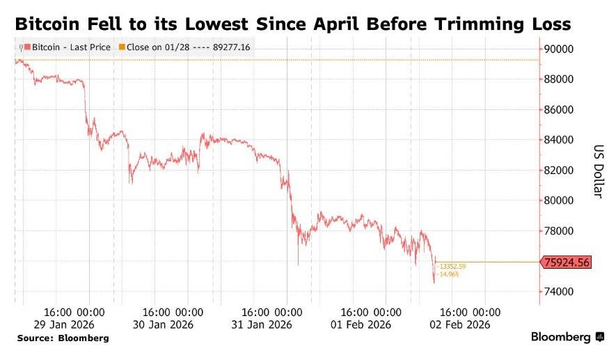 在周一,比特币这一全球最大市值加密货币一度下跌2.5%,跌至74,541美元,接近自唐纳德·特朗普重新回到白宫以来的最低水平——即重新回到此前“Liberation Day”(解放日)关税冲击后出现过的价格区域,也就是2025年4月7日当日触及的74,425美元。截至发稿,比特币交易价格有所回升,徘徊于76,000美元上方。