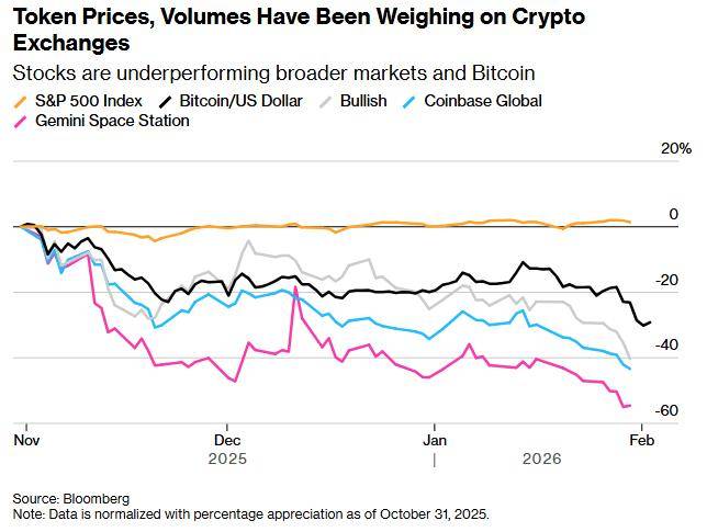 压力点很简单。大多数加密货币交易所的主要收入来源是交易手续费。当交易活动陷入低迷时,其收益便会随之下降。Clear Street分析师欧文·劳估算,Coinbase第四季度的交易量可能同比下滑40%,降至2640亿美元。1月份的活动趋势更为疲软,这意味着按照当前的发展态势推算,本季度截至目前的运行率可能还不到去年水平的一半。