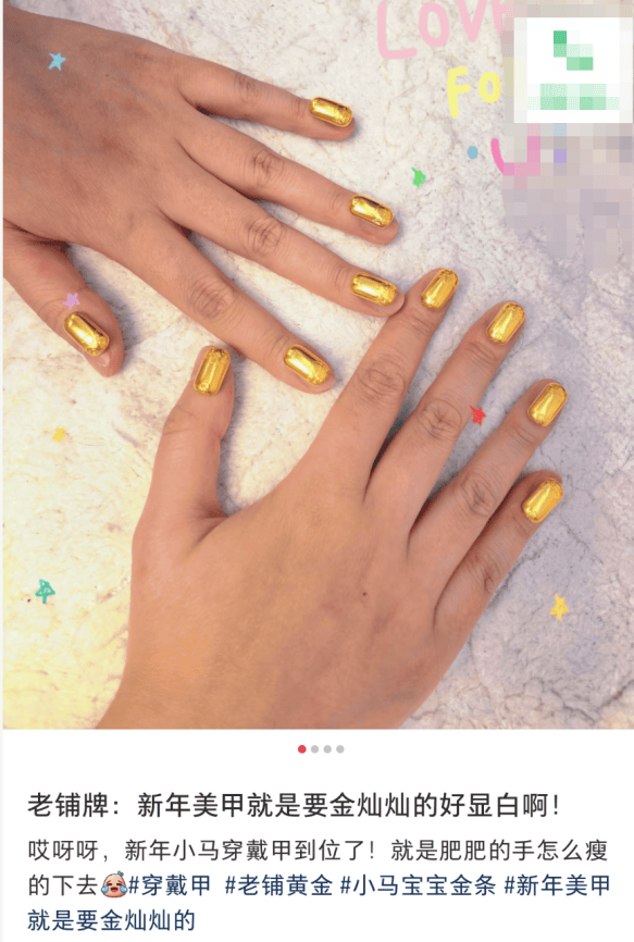 另外,六福珠宝、周六福等品牌店铺的店员,也将金饰用于美甲“宣传”,在社交媒体进行营销。