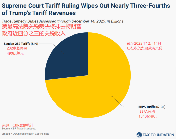 据第三方机构税收基金会(Tax Foundation)估算,2026年至2034年,借助《国际紧急经济权力法》推出的大部分新增关税,原本可为联邦政府带来1.4万亿美元财政收入。