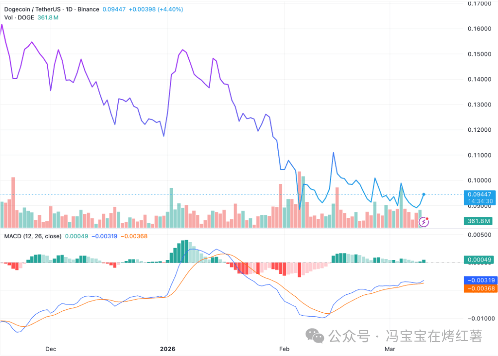 这个支撑线是从上一轮上涨行情后形成的高点逐步抬升起来的,经过多次验证,有效性比较强。截至发稿,狗狗币在0.094美元附近,依然站在这条支撑线月能不能守住这个位置,很关键。如果能收在支撑线上方,形态就算保住;一旦月线收盘跌破,那这个三角旗形结构就可能失效,看涨逻辑也要打折扣。