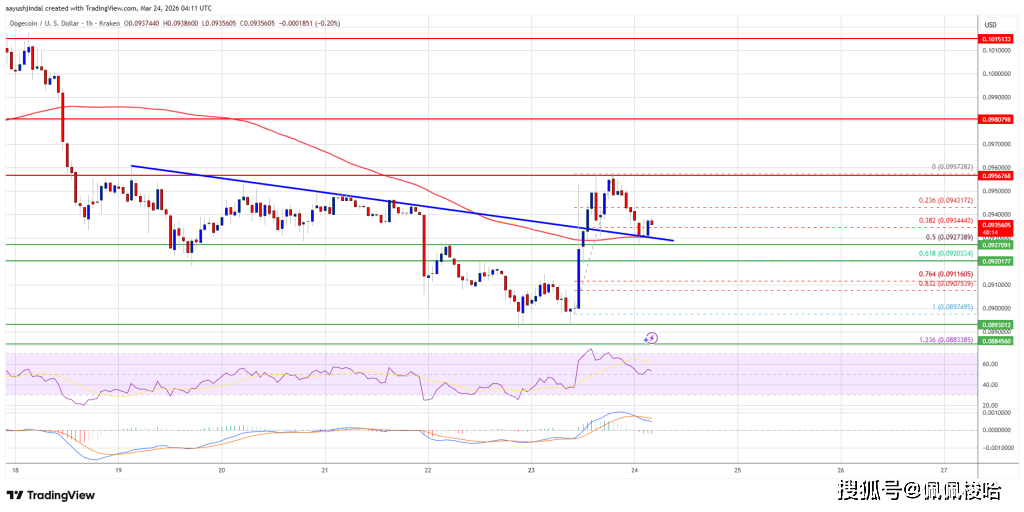 狗狗币价格目前交易于 0.0925 美元上方,并高于 100 小时简单移动平均线。如果价格继续上涨,上方的直接阻力位在 0.0950 美元附近。多头面临的第一个主要阻力位可能在 0.0955 美元附近。