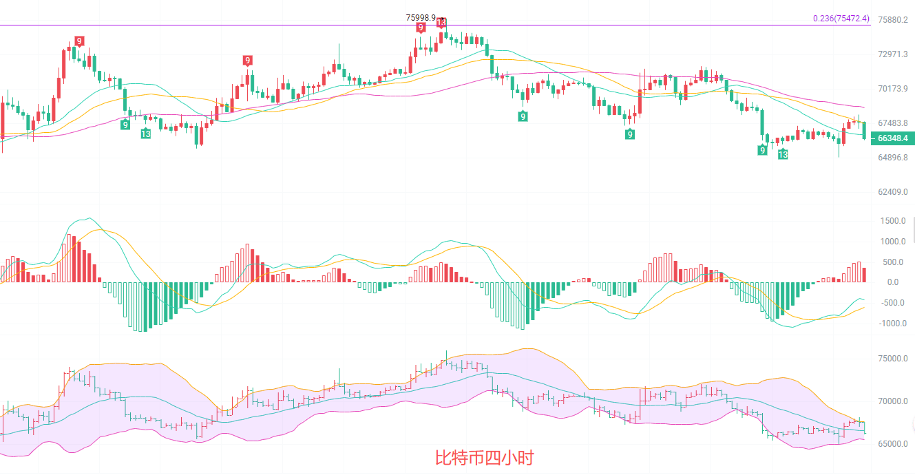 四小时处于下降通道内的弱势震荡,K线形态呈现反弹无力、下跌有支撑 特征,多次下探64918低位后反弹,但反弹K线实体短小,量能严重不足。MA20、MA30、MA60呈向下发散态势,价格持续承压于MA30下方,短期均线压制效应显著。MACD北上动能匮乏,仅为超跌后的技术性修复。布林带在缩口通道内震荡,若跌破下轨将确认下降通道破位,进一步下探空间打开;反之反弹至中轨附近则以逢高做空为主,暂时68000南下持有顺应中期南下趋势。