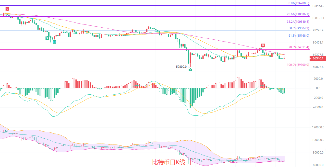 比特币日K线量价配合偏空,反弹阶段成交量持续萎缩,北上资金进场意愿低迷。价格在66000到67500区间形成震荡平台,属于典型下跌中继形态。布林带开口向下,价格贴下轨运行,未触及中轨压力;后续若有效跌破65130,将进一步测试59800关键支撑,日线级别下跌空间仍在打开,支撑空单继续持有。