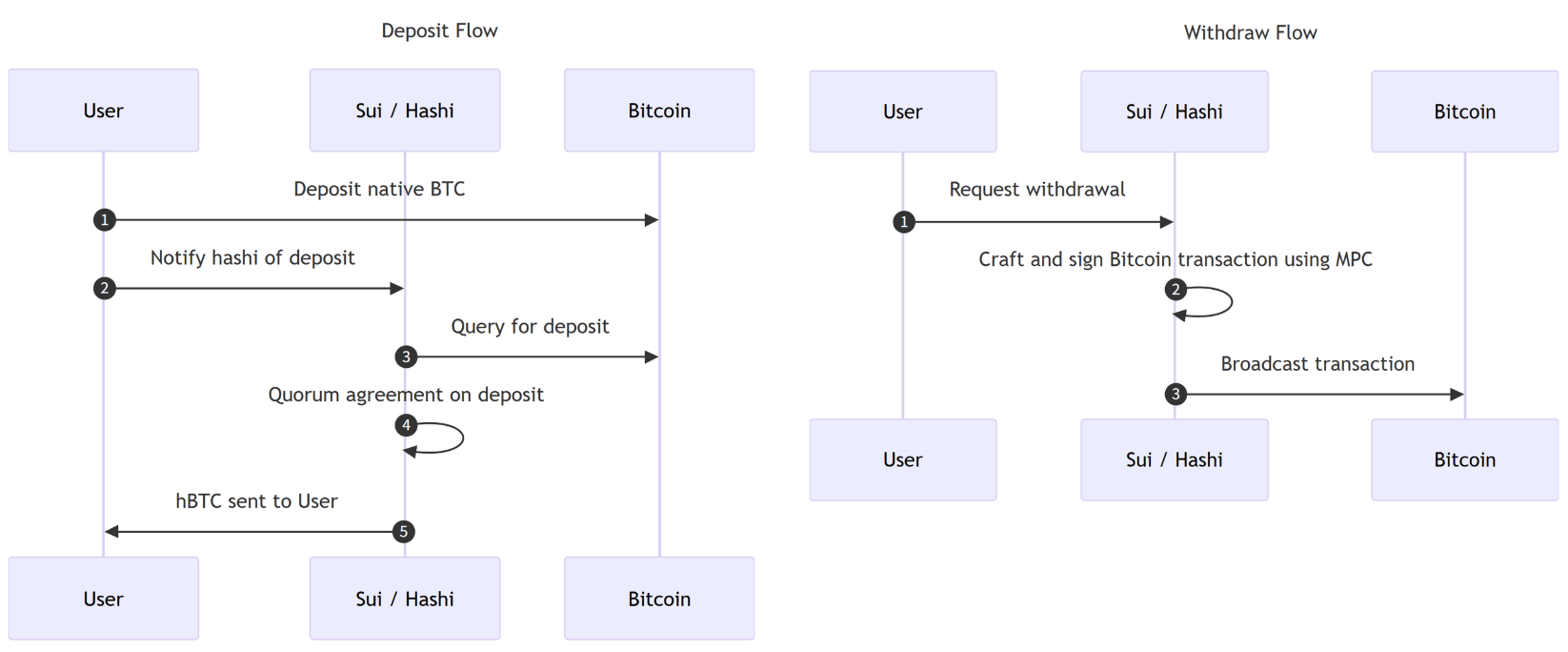 Hashi 是由 Mysten Labs 开发的首个去中心化比特币抵押原语,开发者可以在 Sui 原生智能合约语言中,主动处理比特币网络的 UTXO。