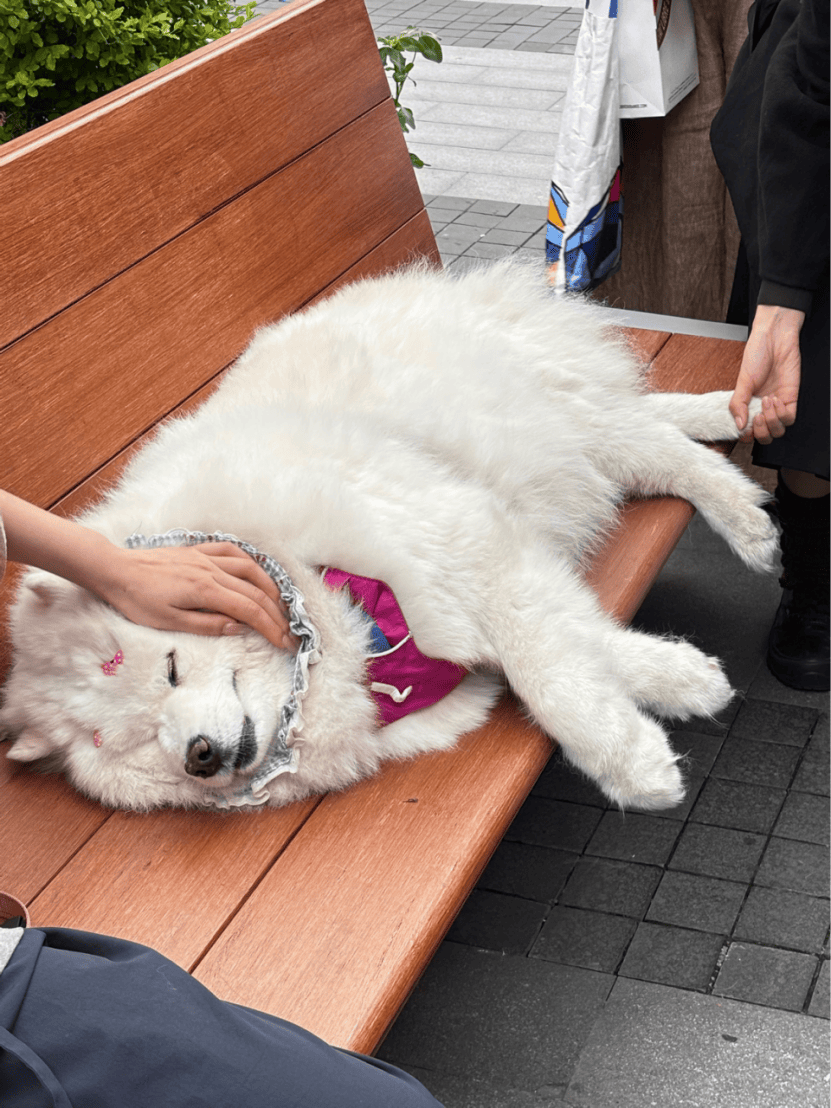 一只躺在长椅上酣睡的萨摩耶犬,引来了路人姨姨们的围观,身穿玫红色西装马甲款胸背带,毛茸茸的,一起一伏,似乎周围的纷扰都与它无关了。