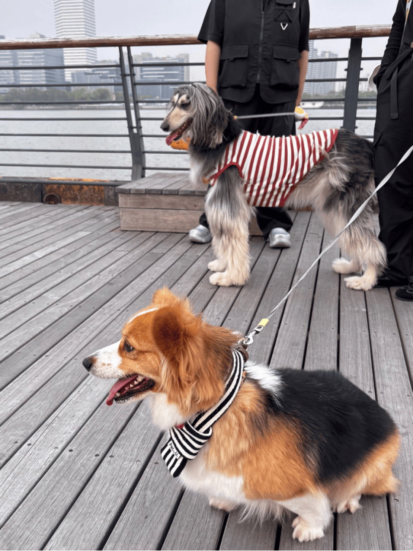 进阶的装扮,是各式各样的时尚衣服。阿富汗猎犬的头部毛发长而柔顺,在滨江步道的风里被吹拂起来,搭配着红色条纹海魂衫,像是刚从度假邮轮上下来的优雅小姐。