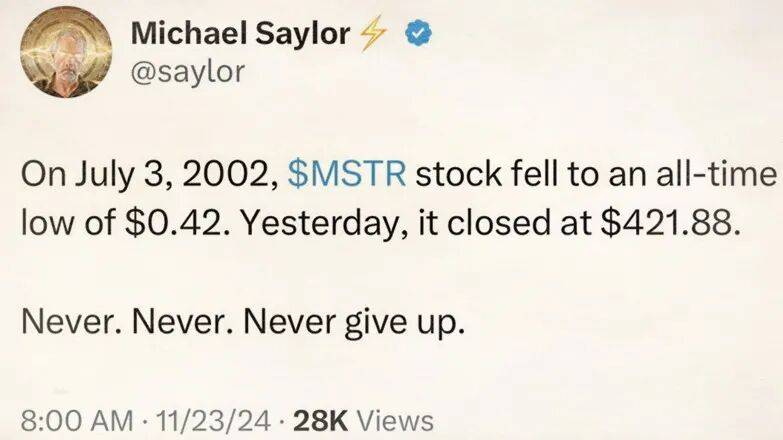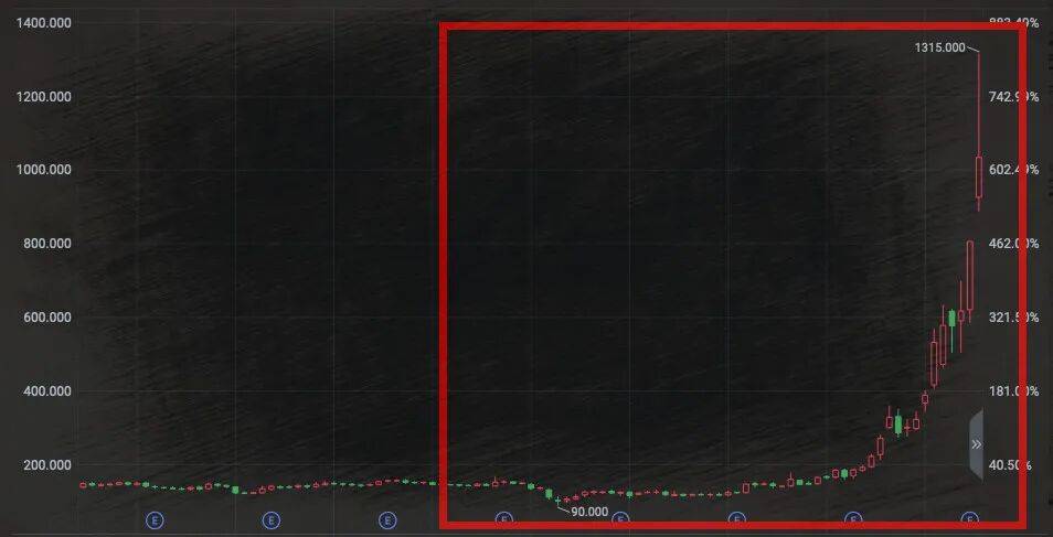 MSTR 的股票(那个带着杠杆的比特币)从最低的 90 块钱,狂飙十几倍到 1315 。赛勒(以美元计)的身价重新梦回 2000 年。