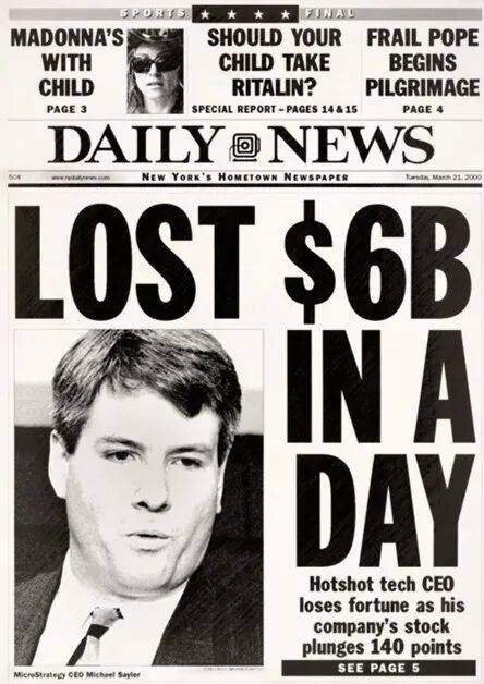 但赛勒性格如此,他来世间从来不是为了“过活”,而是为了“过瘾”。极度超前的愿景和极度激进的财务操作,让 MicroStrategy 在互联网泡沫破裂时高台跳水,粉碎性骨折。