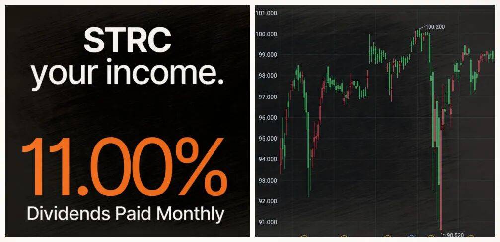 就拿其中最典型的 STRC 来说:它面值 100,参考当前美元的利率定出一个更高的利率(比如 11%),定价 90 块,你买了,就可以按月收到利息。