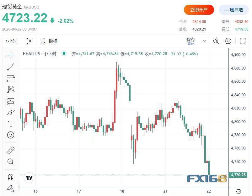 美市盘中,现货黄金扩大跌幅至超2%或逾100美元,跌至4720美元下方。