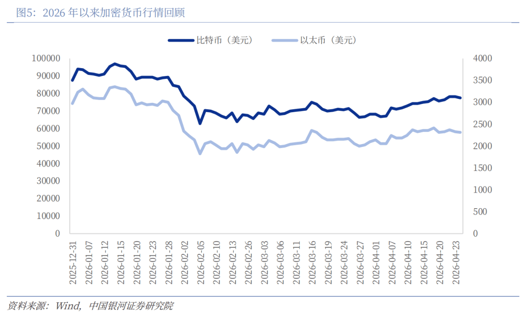 2026年4月20日至24日这一周,加密货币市场呈现震荡上行后小幅回落的走势。比特币自20日的75876.92美元起步,连续上涨至23日的周内高点78281.32美元,累计涨幅约3.2%,随后小幅回调至24日的77453.92美元,周涨幅约2.1%。以太币走势与比特币基本同步,从20日的2314.56美元升至22日的周内高点2375.60美元,之后回落至24日的2315.91美元,周涨幅近乎持平、微涨约0.06%。从成交量与市场情绪来看,周初至周中资金明显流入,推动价格稳步攀升,整体来看,以太币表现弱于比特币。