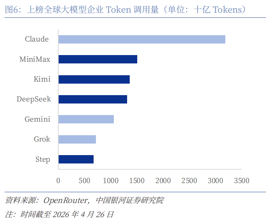 本周全球大模型调用量持续高位运行,OpenRouter周调用总量达19.5万亿Token,较上周增长1.1万亿Token,市场热度不减。其中,中美模型调用量差距缩小,竞争态势更趋胶着;美国模型本周合计调用量达4.970万亿Token,较上周有小幅回落;中国模型本周合计调用量达4.857万亿Token,较上周有所提升。国产阵营内部,MiniMax以1.504万亿Token的调用量继续领跑国内,位列全球第二;Kimi以1.36万亿Token的调用量跻身全球第三,DeepSeek本周调用量达1.31万亿Token,三者构成国内第一梯队。美国阵营中,Anthropic Claude系列以3.189万亿Token居全球首位,Google Gemini调用量为1.06万亿Token,Grok本周调用量为7210亿Token,整体表现平稳。