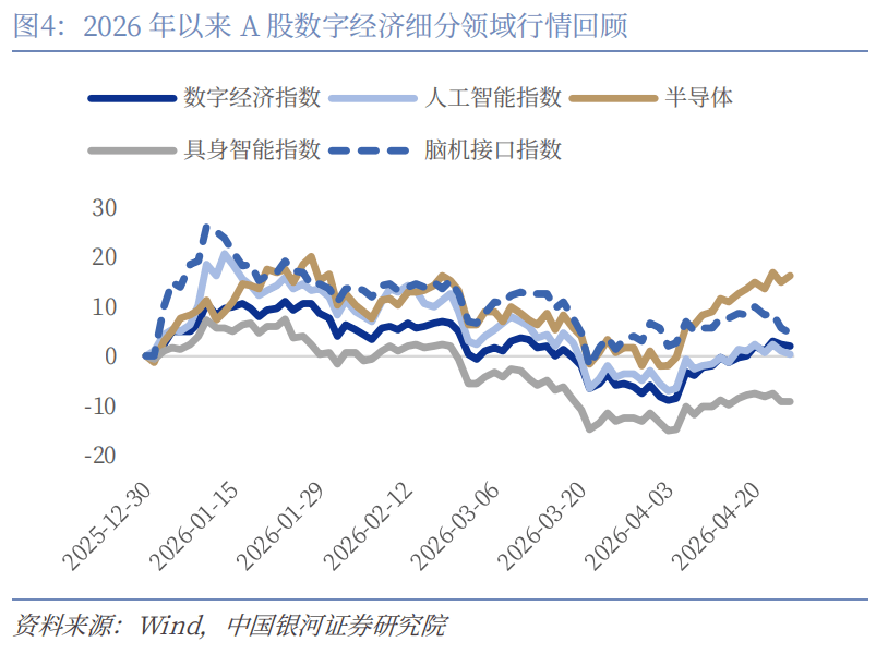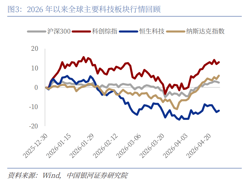 2026年4月20日至4月24日,科技板块整体呈现出高位震荡中的结构分化特征,表现为“硬件相对稳健、应用端分化、波动有所加大”。其中,以半导体为代表的硬科技方向表现较为突出,区间上涨约1.20%,并在周内创出阶段新高,与科创综指(基本持平)及纳斯达克指数(上涨约1.77%)形成一定共振,反映出全球AI算力相关需求仍具支撑。相比之下,恒生科技指数全周下跌约3.22%,或与市场流动性环境及投资者风险偏好变化有关。人工智能指数小幅回调(约-1.80%),数字经济指数整体保持平稳,阶段性表现弱于部分硬科技板块,显示应用相关方向在前期上涨后进入消化与整固阶段。同时,具身智能、脑机接口等前期涨幅较大的细分领域亦出现一定回调,反映出市场在主题轮动中的正常调整。总体来看,资金配置呈现出向具备产业支撑与全球定价特征的算力及上游环节适度倾斜的趋势,而应用端则更多处于节奏切换与预期再平衡过程中,科技板块整体或延续结构性分化运行格局。