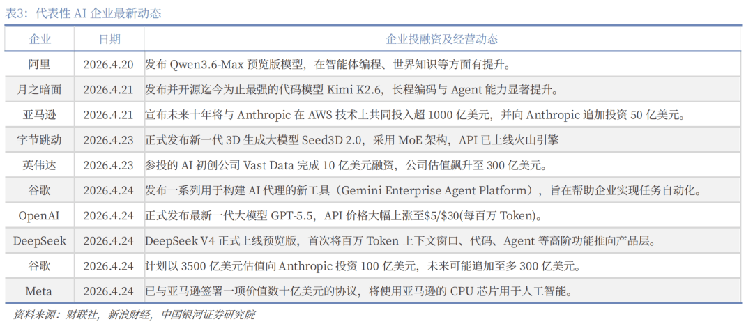 技术前沿:基础模型加速迭代,AI竞争转向长上下文、Agent与基础设施协同。OpenAI发布GPT-5.5,DeepSeek推出V4预览版,阿里、Kimi、字节等模型同步迭代,显示基础大模型竞争正从通用能力评测转向真实任务执行。长上下文、编程能力、工具调用、智能体和国产算力适配成为新一轮升级重点。与此同时,3D生成、车载智能、模型平台化以及“芯片—云平台—能源系统”布局加速推进,AI产业链正由模型供给转向生态服务与基础设施协同竞争。
