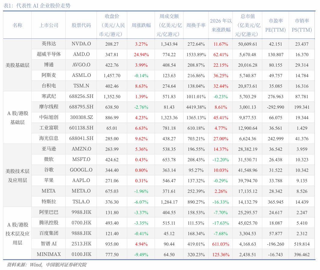 从代表性AI企业的股价走势来看,2026年4月20-24日这一周表现出明显的“算力硬件强、科技巨头与港股应用层弱、题材个股剧烈分化”的特征。美股基础层中,超威半导体以24.94%的周涨幅领涨,台积电、博通、英伟达分别上涨8.63%、3.99%、3.27%,显示出市场对AI算力芯片的持续追捧;而阿斯麦微跌0.14%,表现相对落后。A股/港股基础层同样偏强,海光信息、工业富联、中际旭创分别上涨9.62%、6.63%、4.23%,但摩尔线%,内部有所分化。相比之下,美股技术层及应用层整体偏弱,特斯拉下跌6.07%,META下跌1.96%,亚马逊、微软、谷歌、苹果虽小幅上涨但涨幅均在0.3%-5.4%之间,明显弱于基础层。港股应用层表现更弱,阿里巴巴、腾讯分别下跌3.37%和3.35%,MINIMAX大跌9.49%,仅智谱AI逆势上涨4.94%。总体而言,资金明显向算力基础层集中,尤其是半导体芯片和光模块方向,而大模型应用、互联网平台及部分高估值题材股则承受较大抛压,显示出市场对AI产业链的偏好进一步向上游硬件收窄。