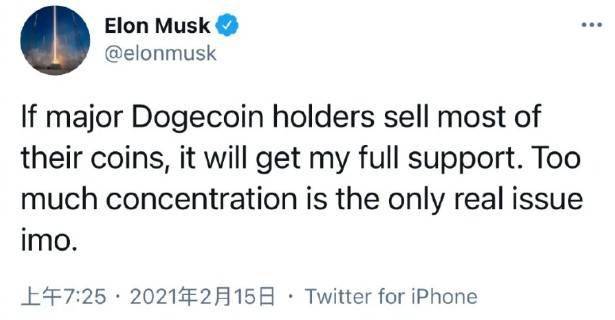 2月15日,特斯拉CEO埃隆·马斯克发推称:“如果狗狗币的主要持有者出售大部分币,我将全力支持狗狗币,持仓太集中是唯一真正的问题。” 马斯克曾被称为“狗狗币CEO”,并将其选为自己“最喜欢的”加密货币,本周他在还在Twitter上写道:“狗狗币被低估了。”