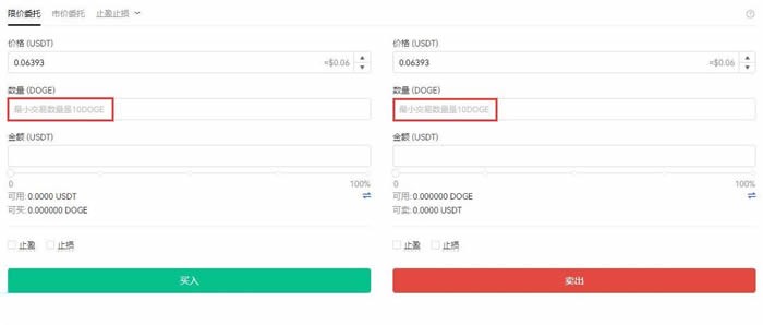 第五步:填写购买数量,点击买入,若是卖出,填写卖出量,点击卖出即可。注意:DOGE最小交易数量是10DOGE
